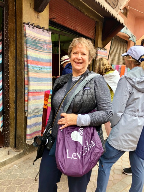 Leslie Geffen in front of weaver's shop in Marrekesh, Morocco.