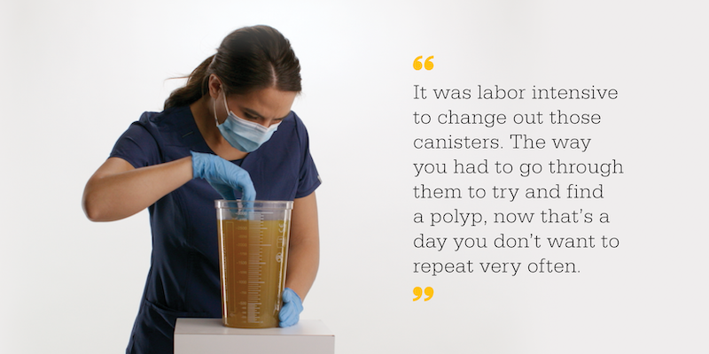 What’s made a difference for Hall in efficiency and staff safety was switching from using canisters to a constantly closed waste management system. Not only did canisters have to be changed during a procedure—occasionally two to three times—but a lost polyp meant manually searching through the waste.