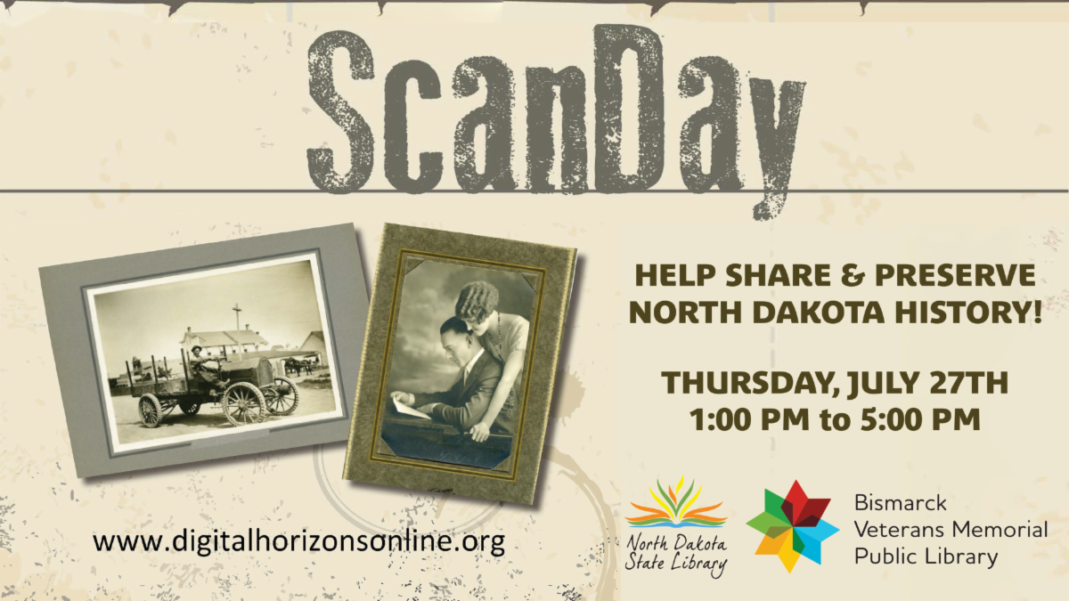 Help share and preserve North Dakota history! Bring in personal documents, photos, objects, etc., to be scanned and then displayed online on Digital Horizons. All participants will be provided flash drives with digital copies of their items. Please contact the library to reserve a time slot. Each participant may bring 10-15 items. For more information, visit www.tinyurl.com/scanday.