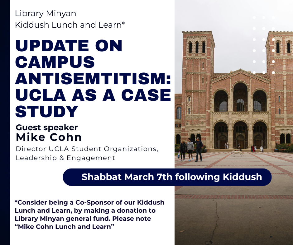 This Shabbat we will hold our Annual Library Minyan meeting as required by our Charter. Our enhanced Kiddush Lunch is sponsored by the Library Minyan to facilitate the meeting. Please come and learn what is happening and what is planned for our Minyan and to share your concerns.