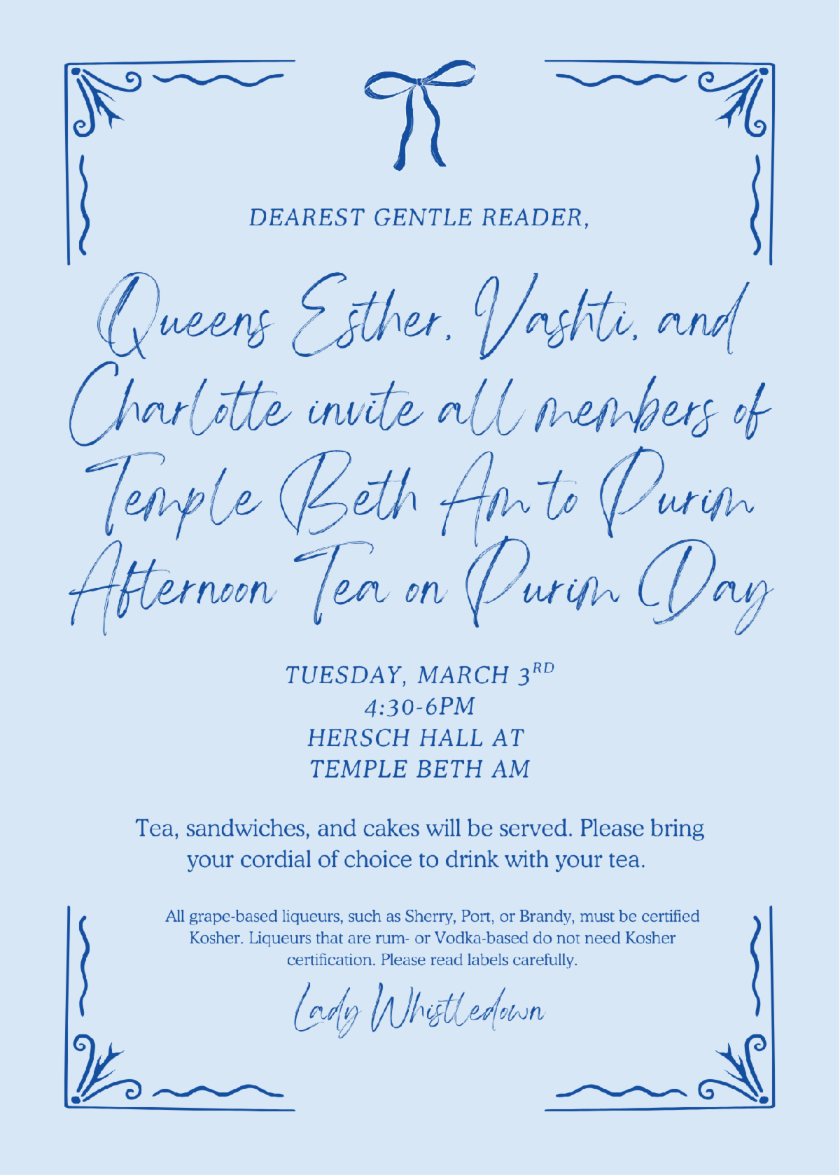 Our schedule of Purim activities is arranged cooperatively with TBA. The Erev Purim Schedule can be viewed here: https://www.tbala.org/erev-purim. There will be a LM Sponsored Purim Seudah on Tuesday afternoon at 4:30 in Hersch Hall. The entire TBA community is invited to join us. Our theme this year is a "Bridgerton Tea Party." See the invitation below from Lady Whistledown.