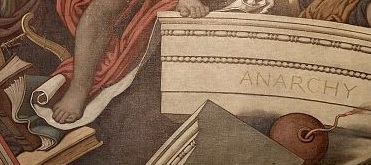 Above the Reading Room central door to the left is the painting titled "CORRUPT LEGISLATION LEADS TO ANARCHY" where the figure representing Anarchy is burning the scroll of learning while she tramples on a Bible.