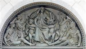 The right-hand door, representing WRITING, has above it four figures depicting groups who influenced the world by written literature: an EGYPTIAN, a JEW, a CHRISTIAN and a GREEK.
