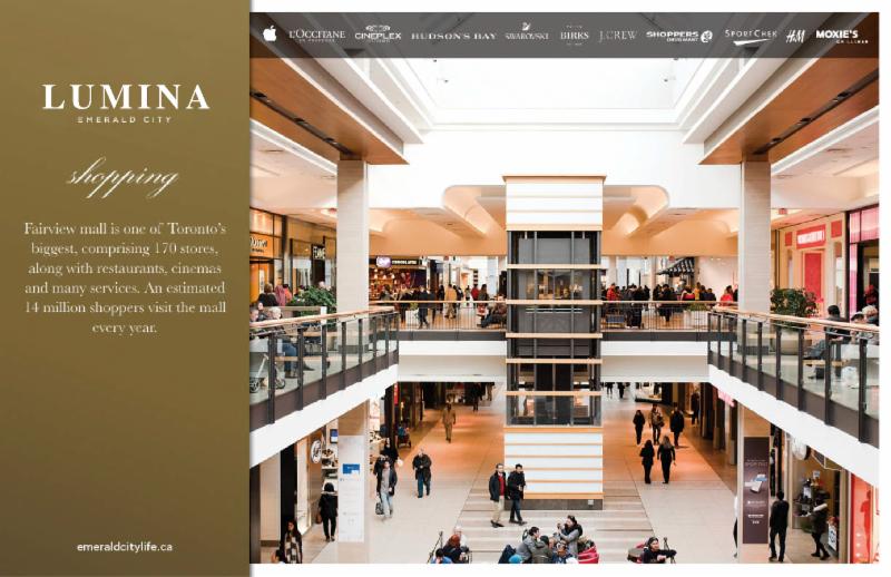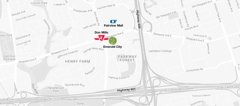 Across the street at Sheppard & Don Mills, awaits Fairview Mall, one of Toronto’s more desirable lifestyle destinations. With over 170 stores and services, an extraordinary selection of big-brand retailers, luxury labels, restaurants – even a 17-screen cinema – expect to stop in to shop at your slightest whim.