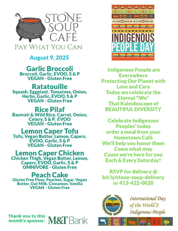 | | August 21 Back To School Family Center Pajama Party | | August 21 Root Fiyah at Peskeompskut Park, 7PM | | August 22 Summer Concert Series: Matt York | | August 23 Stone Soup Cafe's 20th Annual Harvest Supper | | August 24 Erving Public Library Book Club | | August 26 Nurturing Fathers | |