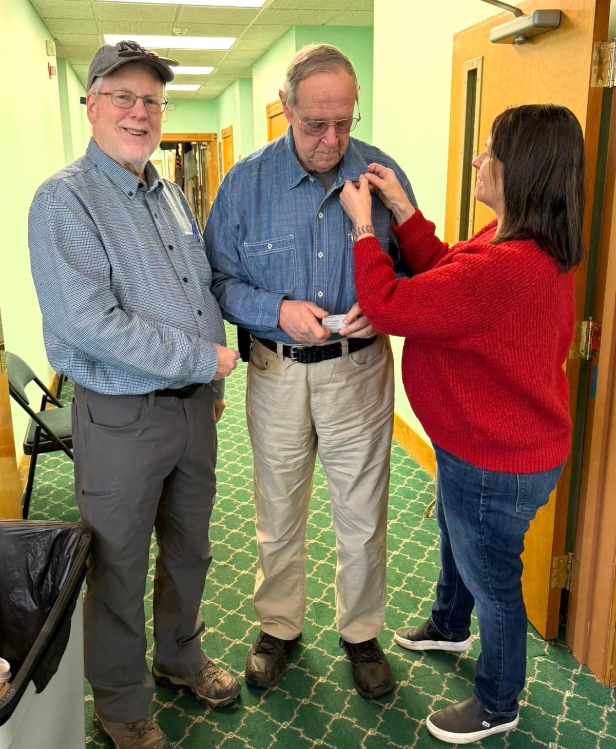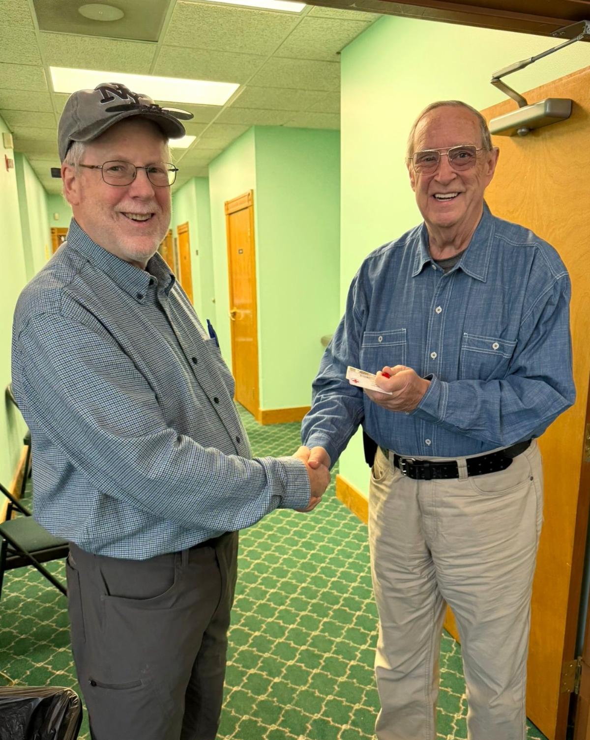And we gave special recognition to donor and congregation member Jack Gordon for his incredible milestone of donating 17 gallons of blood. Jack, thank you for your long-standing commitment and for your life-saving contributions to the community. (Photos below are of the Red Cross manager pinning a recognition pin to Jack's shirt and Bill congratulating Jack.) Jack is also very active in the Red Cross sheltering program, as well as several other emergency management activities.