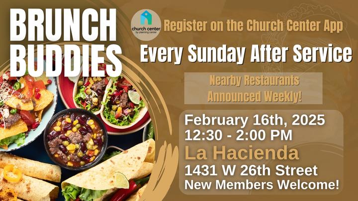 Join us after service for in-person Brunch Buddies, Sunday, February 16th, after service at La Hacienda, 1431 W 26th St. View MENU. | |
