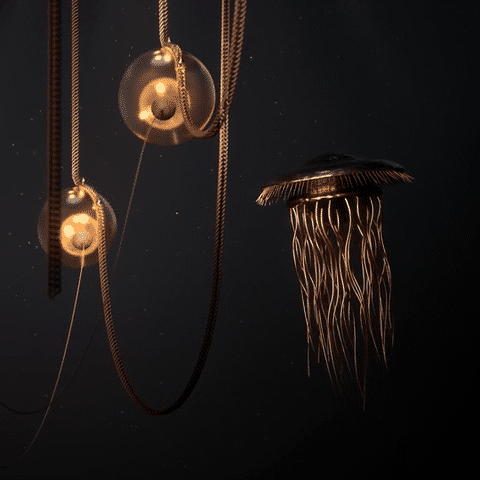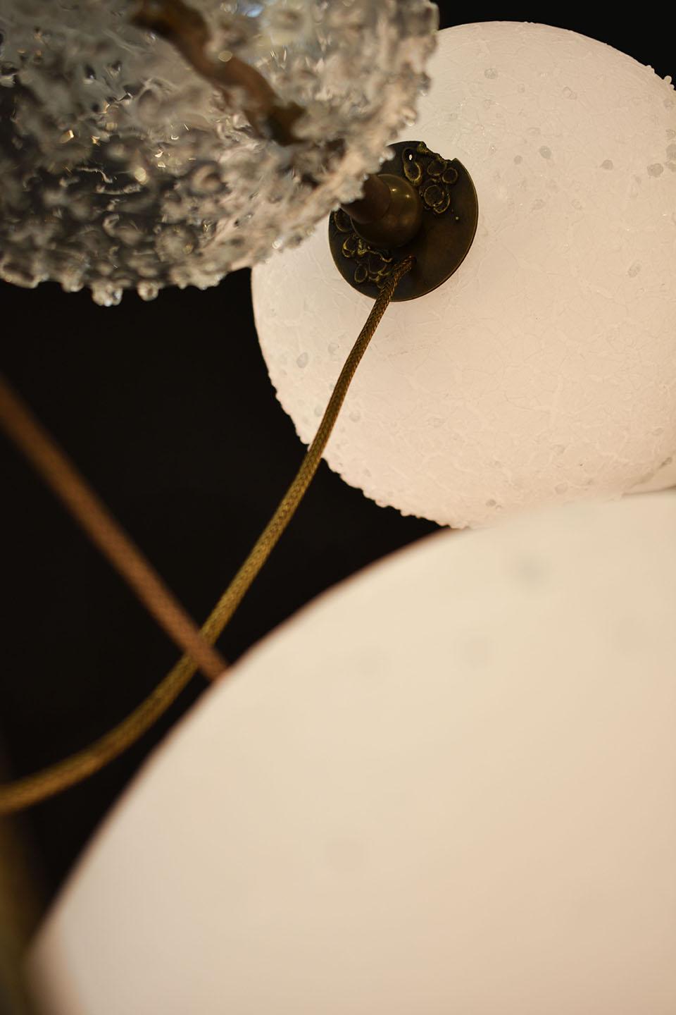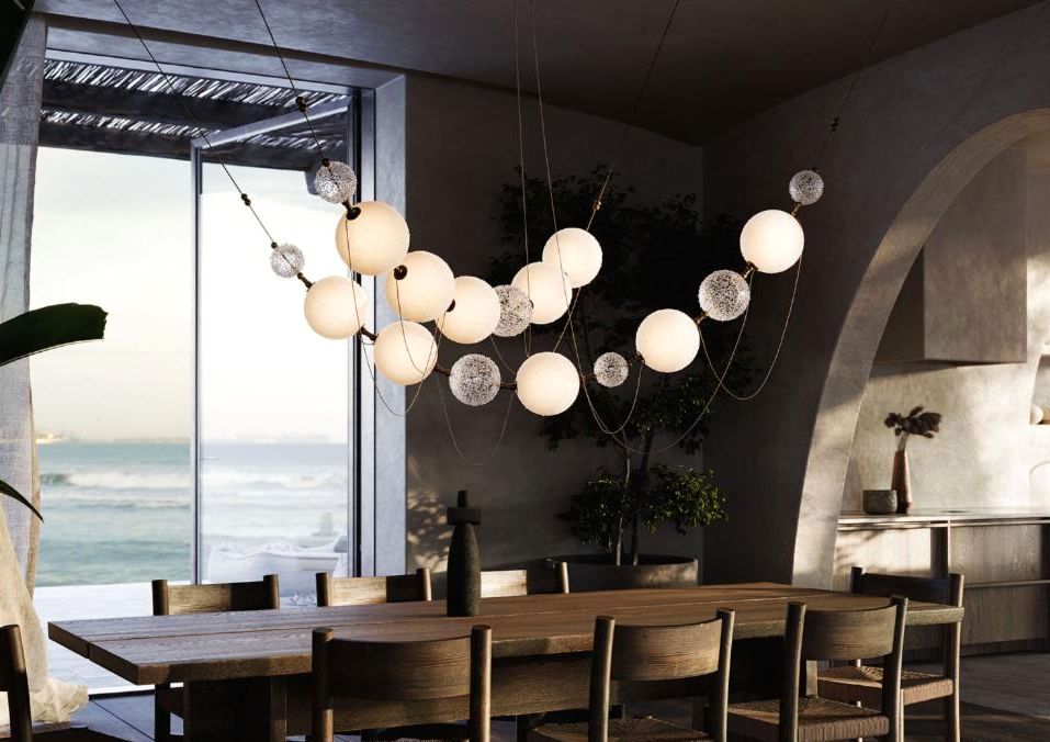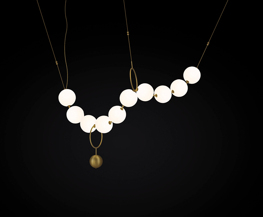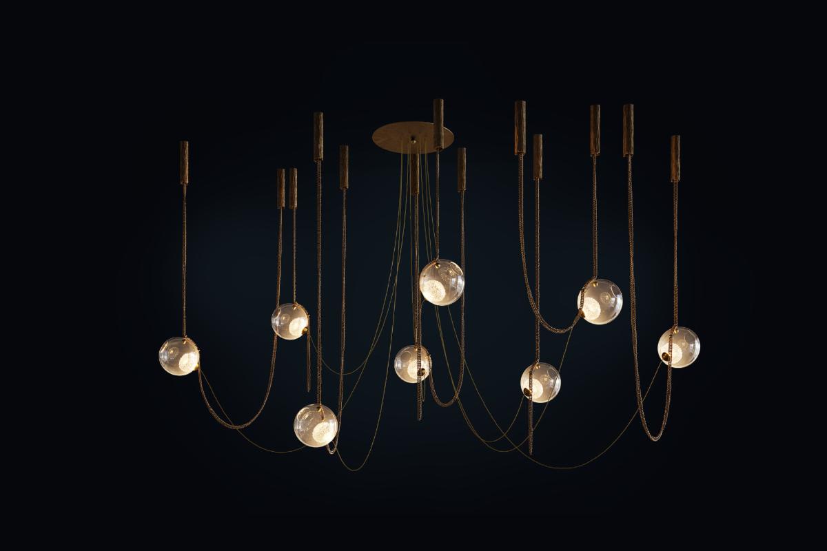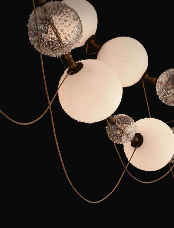 WHILE COCO PRESENTS A CLEAN AND SMOOTH, ELEGANT FINISH, INSPIRED BY THE PEARLS OF COCO CHANEL, COCO DE MER EXPLORES A FANTASY WHERE IMAGINARY DIVERS HAVE UNEARTHED THE CHANDELIER UNDER THE SEA . . . .METAPHORICAL MOLLUSCS AND SEAWEED HAVE CLUNG TO ITS SURFACES, BESTOWING COCO DE MER WITH A TEXTURED AND MYSTERIOUS APPEARANCE ONLY MOTHER NATURE CAN SCULPT SO WELL. SYMBOLICALLY STRUCK BY WAVES OF INSPIRATION, COCO DE MER ENCAPSULATES THE ESSENCE OF THE ORIGINAL COCO, WITH DELICATELY HAND TEXTURED GLASS GLOBES, AND CHAINS REMINISCENT OF SHIPWRECKS LOST AT SEA. |