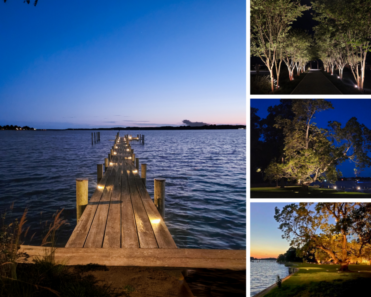 Matt Williams designed lighting that highlights the property from the allée to the dock.. Wires were carefully run beneath the dock and through the bulkhead, while moonlights were placed in mature trees to create a natural, balanced glow. Solid brass fixtures were chosen to withstand the salinity of the Tred Avon River, and multiple lighting zones give the homeowner flexibility to create atmosphere while maintaining safety and security.