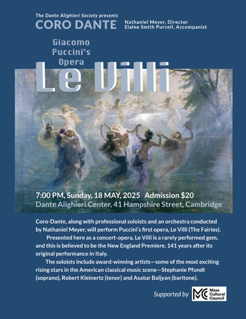 The Pirandello Lyceum's annual concert of Arias - the Bell Canto Opera - is being held at the Dante Alighieri Society in Cambridge on Sunday afternoon at 3:00 p.m. on May 4. It is produced by the renowned composer Bradley Pennington.