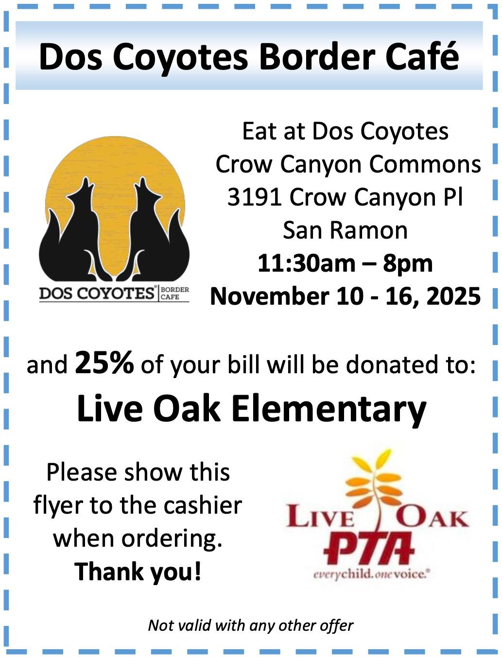 Dine and donate! Enjoy a meal out and help support our PTA! Dos Coyotes - in Crow Canyon Commons - is hosting a Live Oak PTA fundraiser. Go enjoy lunch or dinner from Monday, November 10 through Sunday, November 16 and 25% of your check will be donated to the Live Oak PTA. Show the flyer to the cashier. Thank you for your support!