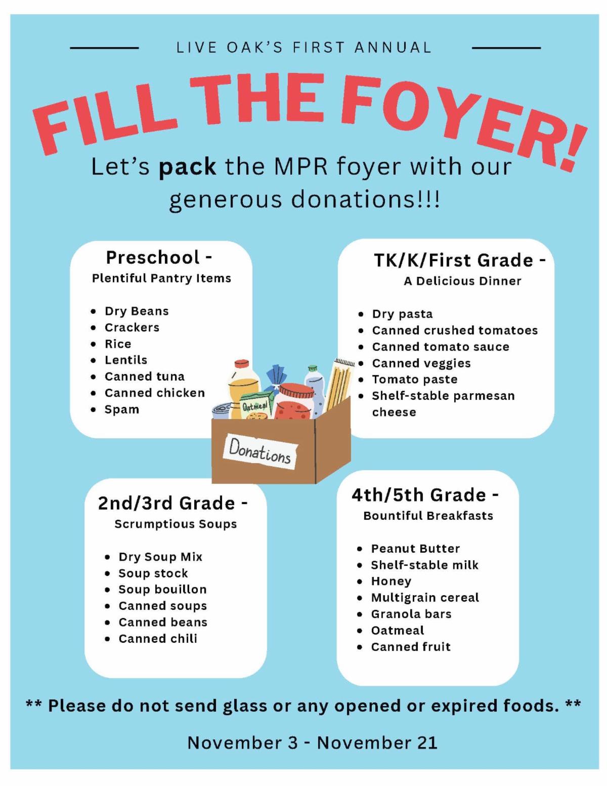 Drop off donations to the bin in the front office at Live Oak November 3rd – December 2nd.