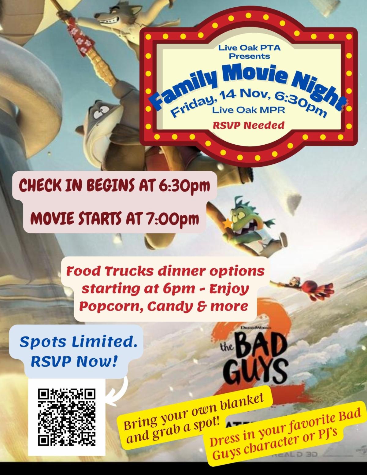 Join us for a FREE indoor Family Movie Night under the stars! Watch Bad Guys 2 on Friday, Nov 14 at Live Oak School. Bring your blankets, dress as movie characters and enjoy a cozy evening with family and friends,