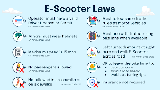 - Definition: An electric scooter is a device with two wheels, handlebars, and a floorboard, powered by an electric motor (CVC §407.5).