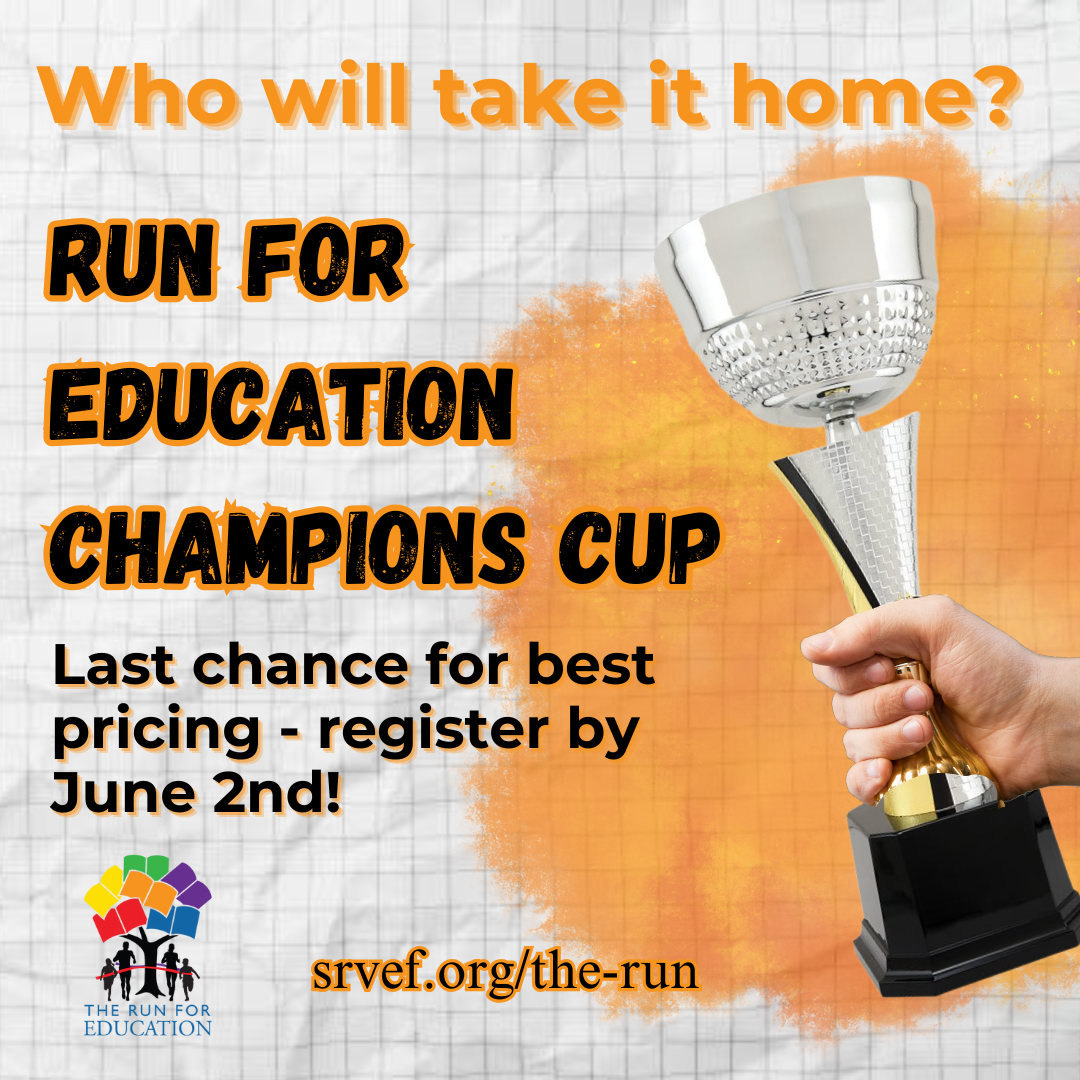 Prices for the 2025 Run for Education go up after Monday, June 2nd! Sign up now for the lowest pricing and help our school bring home the Run for Education Champions Cup! The Cup will once again be passed on to the elementary, middle, and high school with the highest Run participation (by percentage of student population). So don't delay - register today: srvef.org/the-run