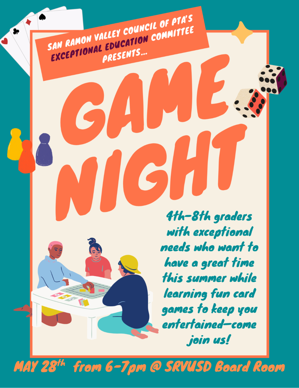 Varun Ganti, a junior at Dougherty Valley High School, has a lifelong interest in board games and started an initiative to use them as tools for connection and learning. He’s led weekly game sessions at senior homes and is now partnering with the SRVCPTA Exceptional Education Committee to bring that work to a new audience. As president of Science Alliance, a districtwide club that mentors younger students in science, Varun has developed meaningful ways to engage with elementary and middle schoolers; an experience that helped inspire this event. Game Night is designed for 4th–8th grade students with exceptional needs and their families, featuring exciting card games that encourage communication, collaboration, and fun. The event will showcase unique card games that put a fresh spin on classic playing cards, offering students and families the chance to take home fun, easy to learn games that make for meaningful screen-free entertainment all summer long.