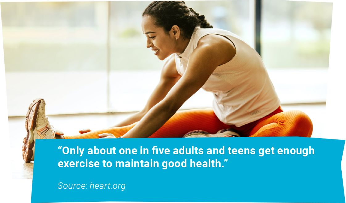 It is recommended for adults to exercise 2.5 hours per week. It is important to include muscle-strengthening activities that target all major muscle groups on at least two or more days per week. If you are wanting to start an exercise regimen, meeting this goal is possible and is something that can be achieved over time. See our PlayWell Section for exercise tips that the American Heart Association recommends for adults.