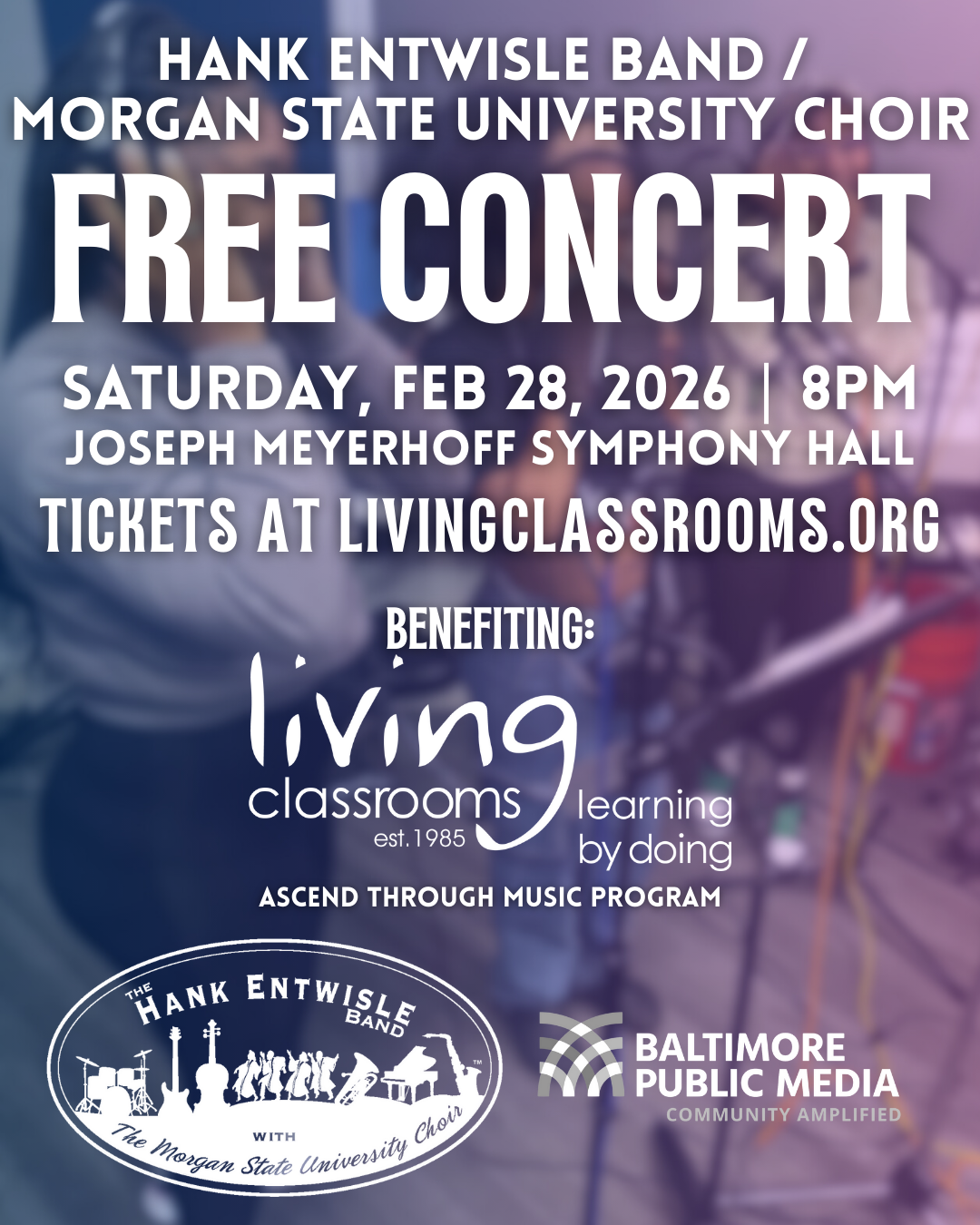 The Hank Entwisle Band and the Morgan State University Choir are performing a concert at the Joseph Meyerhoff Symphony Hall that will benefit Living Classrooms. Featuring 80 voices and 40 instruments, the performance will have a variety of music styles including rock, gospel, R&B, jazz, bluegrass, and more - ensuring a memorable experience for all. The concert will be held on February 28, 2026 at 8:00pm.
