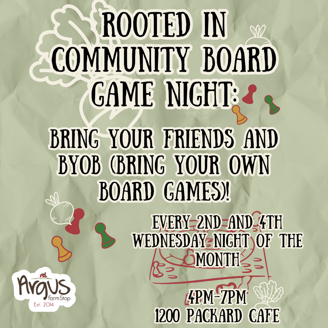 Join your friends at the Packard Cafe every second and fourth Wednesday of the month for our Rooted In Community Board Game Night! Bring a board game, grab a locally brewed beer or wine, and join some great friends with plenty of space for games!