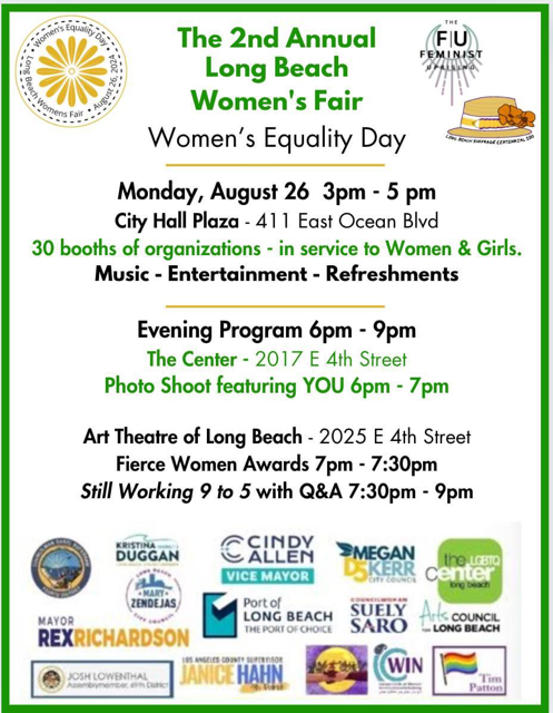 The Long Beach Women's Fair 2024, sponsored by Long Beach Suffrage 100, The Feminist Uprising and Zoe Nicholson, is celebrating National Women's Equality Day. It is a commemoration of Congress signing the 19th Amendment.