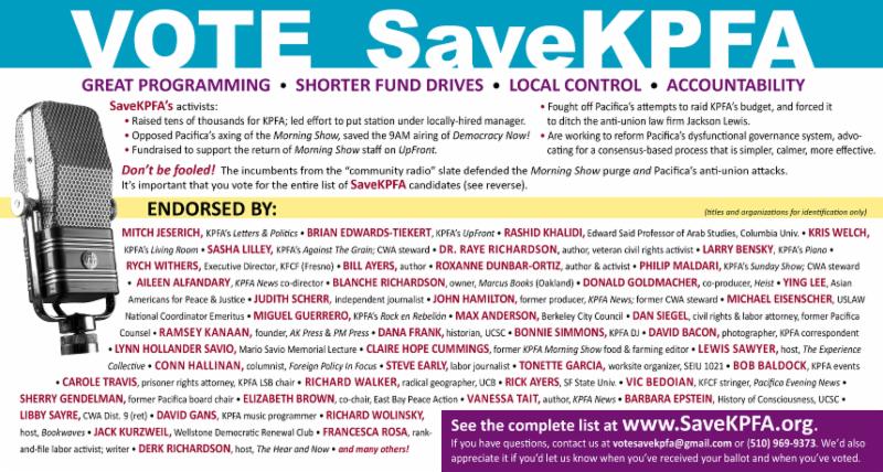 urges listeners to vote for all 7 SaveKPFA candidates named above. We reprint his important letter here: "Five years ago, it looked like KPFA was headed the same way. The old regime at Pacifica had just purged KPFA's biggest fundraiser, The Morning Show. They had hired the country's top union-busting law firm, Jackson Lewis, to fight us.