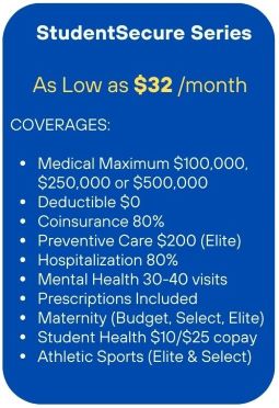 For Schools with lower or no health insurance requirements, our popular and affordable EXPLORER health plan offers a wide choice of Medical coverages (choose $100,000 up to $1,000,000 Medical) and Deductibles (choose $0 up to $500 Deductible). EXPLORER is ideal for STUDENTS needing essential health insurance, STUDY ABROAD groups and many SCHOOLS!