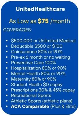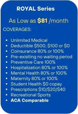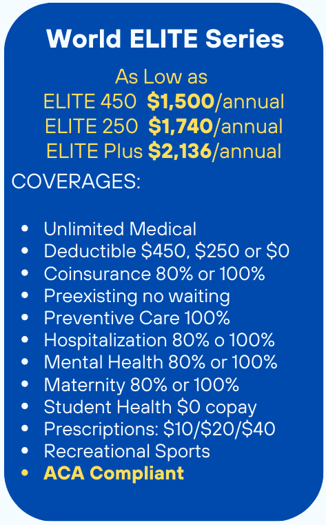 World ELITE is one of the only Fully ACA-Compliant Individual Student health insurance plans, for only $1,740 per year (with only $250 Annual Deductible). ROYAL is ACA-Comparable insurance for only $1,314 (with $100 Annual Deductible). If your School allows Waivers from your School SHIP Insurance Plan, recommend that your Students choose World ELITE or ROYAL Health Insurance for superior insurance coverage for much less cost!