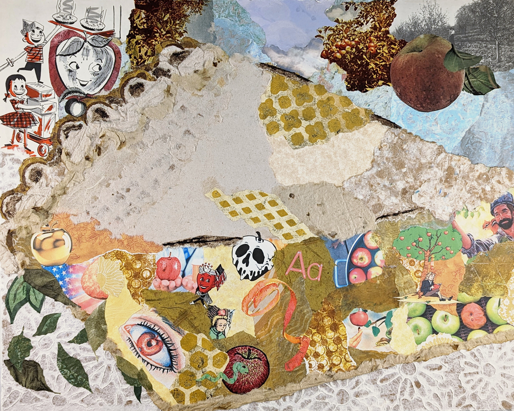 In Folklore Collage Society, Volume 1, Leanne Poellinger explores the symbolism and community of apple pie. She writes, "I have a personal connection to apples. I have lived my entire life in La Crescent: the “Apple Capital of Minnesota.” This small city, nestled on the banks of the Mississippi River in southeastern Minnesota, is known for its apple orchards and beautiful bluffs with spectacular views of the river." (image: As Symbolic as Apple Pie (detail) by Leanne Poellinger (16"x20"; handmade paper, found paper images on hardboard panel; 2023). Courtesy of the artist.)