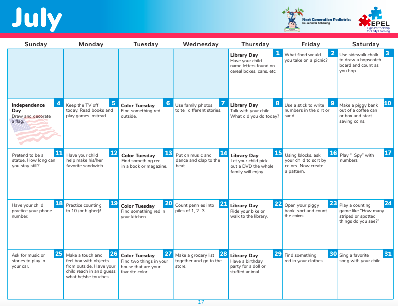 EPEL partnered with Kindergarten teachers to film monthly calendar videos to compliment the Getting Ready for Kindergarten calendar. The videos are added to social media at the beginning of each month in English and Spanish. Check out July's videos. You can share them with families from YouTube under Elgin Partnership for Early Learning or from our social.