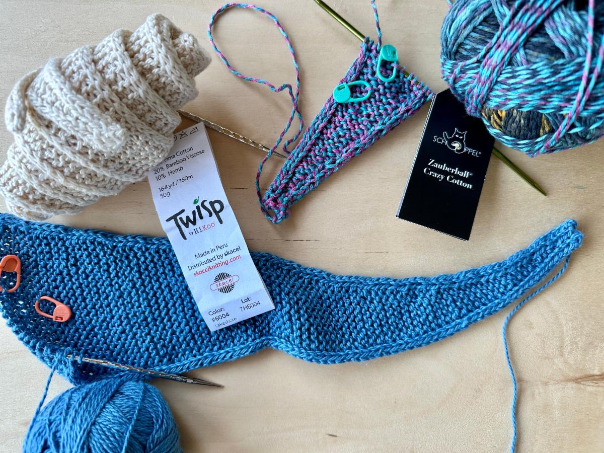 I'm using Zauberball Crazy Cotton for Sophie #5. It's fun to see this multicolor yarn play out its magic as the rows go by. It's color 2368 "Masquerade" and will change from blues and pinks to gold and purple.