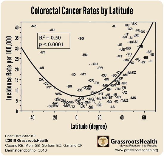 Rates of colorectal cancer, the third most common cancer worldwide and the second leading cause of cancer death, are higher further from the Equator across 173 countries (P<0.0001). Additionally, higher UVB irradiance was associated with lower colorectal cancer risk (P<0.0001) after adjusting for cloud cover and other relevant factors. The relationship is illustrated in the U-shaped “smiley” curve below, which shows higher disease rates in the far northern and southern latitudes – locations that have lower UVB irradiance from the sun. Countries that are closer to the Equator (presenting in the center of the horizontal axis around the 0 degree latitude) have higher UVB irradiance and tend to have lower disease rates.