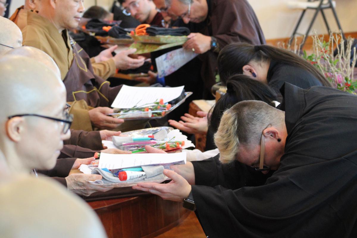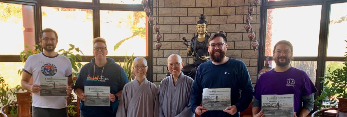 Alex, Rhi, Grant, and Derek took the Three Refuges and the Five Precepts during the Kathina Offering Ceremony! We congratulate them on becoming fully devoted Buddhists. They have vowed to follow the teachings of the Buddha, study the Dharma, seek guidance from the Sangha, and observe the Five Precepts: protecting life, being honest, speaking truthfully, fostering good relationships, and maintaining a clear mind at all times!