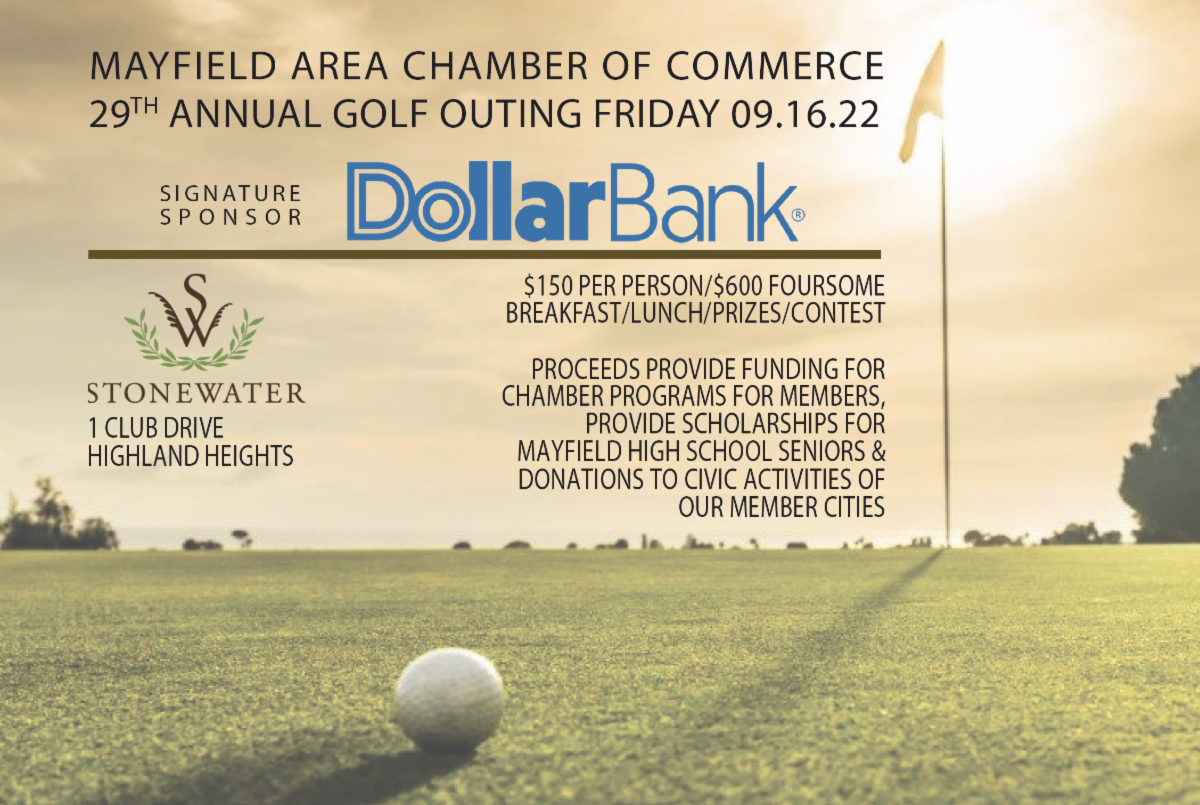 It's time to PARty! Enjoy a day of golf at the prestigious StoneWater Golf Club and show your support for the Mayfield Area Chamber of Commerce! All proceeds provide funding for chamber programs for members, scholarships for Mayfield High School Seniors and donations to civic activities of our member cities.