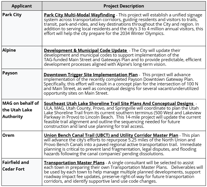 Each project improves coordination between land use and transportation planning and advances the Wasatch Choice Vision.