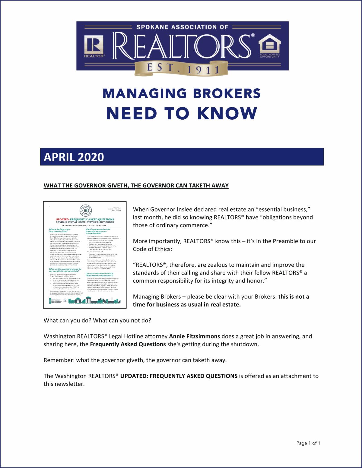 Offered here is the April edition of Managing Brokers Need to Know with priority information for Managing Brokers and select content from the Weekly Notices.