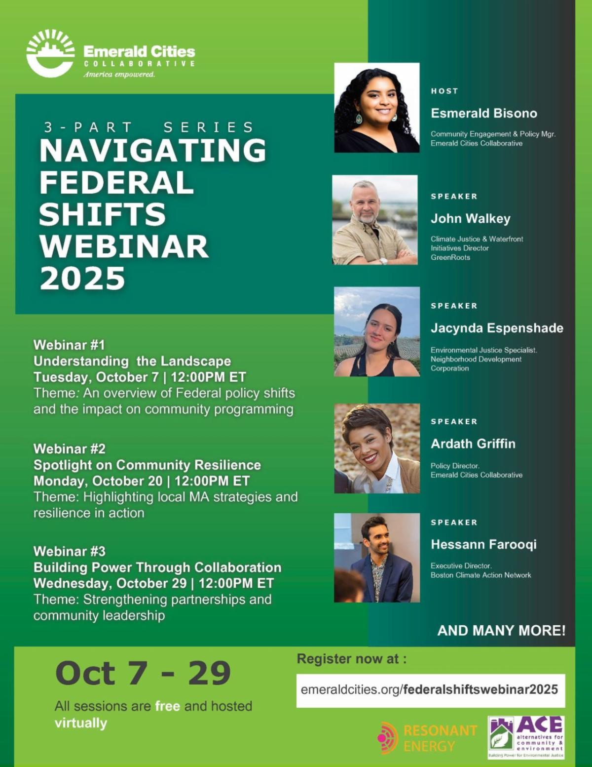The Fall 2025 series, organized by Emerald Cities Collaborative, Resonant Energy, and Alternatives for Community and Environment, will bring together guest speakers to unpack evolving federal policy changes and share practical strategies for local action centered on community resilience, equity, and collaboration. The webinars will be geared towards non-profit and advocacy leaders, local government staff, funders, and community partners working on climate, housing, workforce, and economic justice.