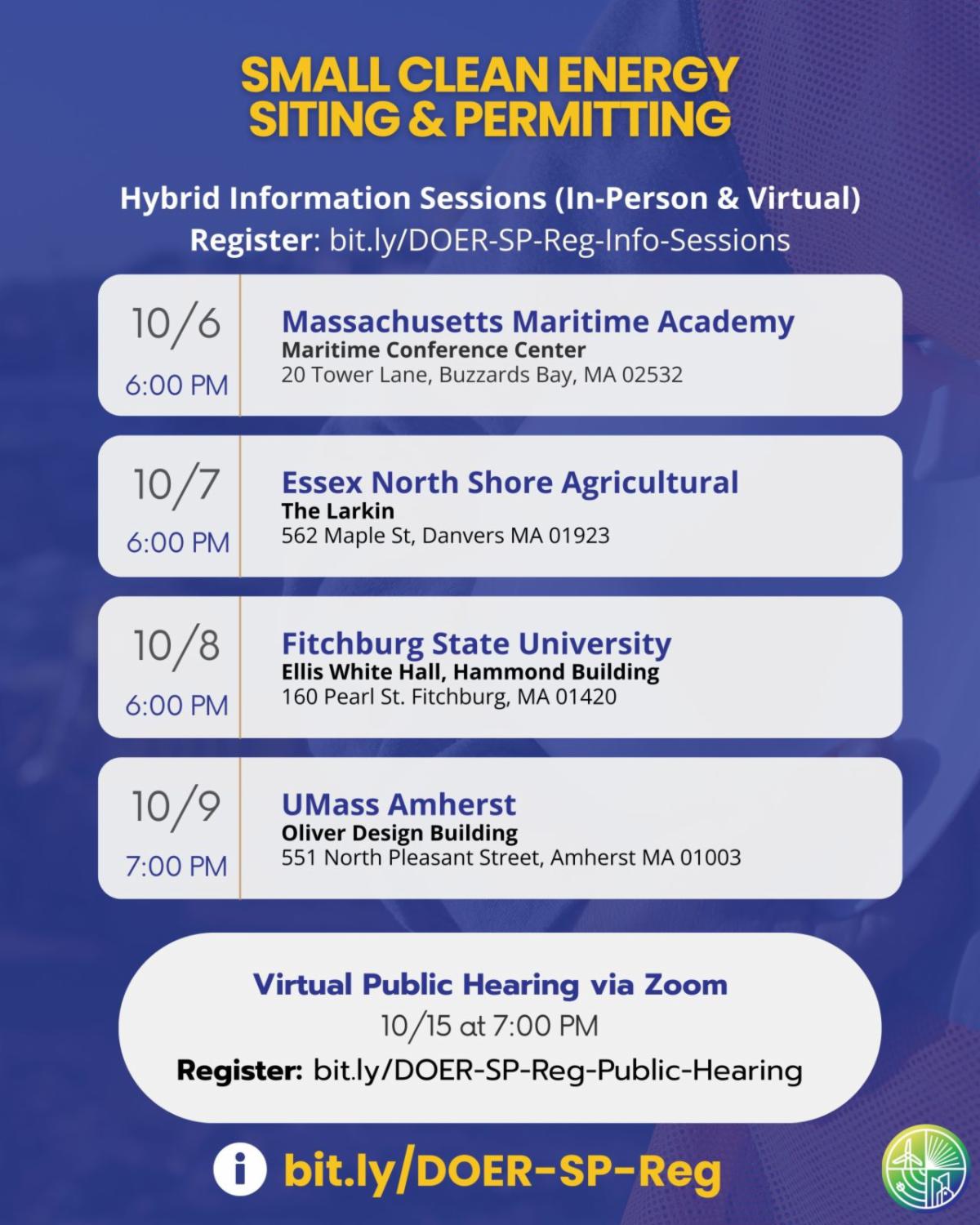 Can't make it to the in-person sessions? DOER is also hosting a virtual public hearing on Wednesday, October 15 at 7pm. Register for DOER's public hearing.