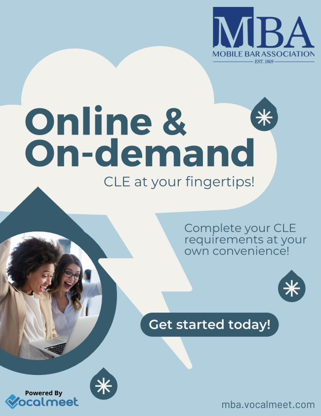 In April, your Mobile Bar Association continues to move forward with great activities! While there is not a general member meeting this month, our committees and sections are fully engaged, with many providing CLE opportunities! To highlight just a couple of events, the Women Lawyers Section has a Lunch and Learn CLE on Tuesday, April 8th at Wintzell’s on Dauphin Street, and the Young Lawyers Section has its annual fun social on Thursday, April 17th at Greer’s on St. Louis Street, sponsored by Beasley Allen.