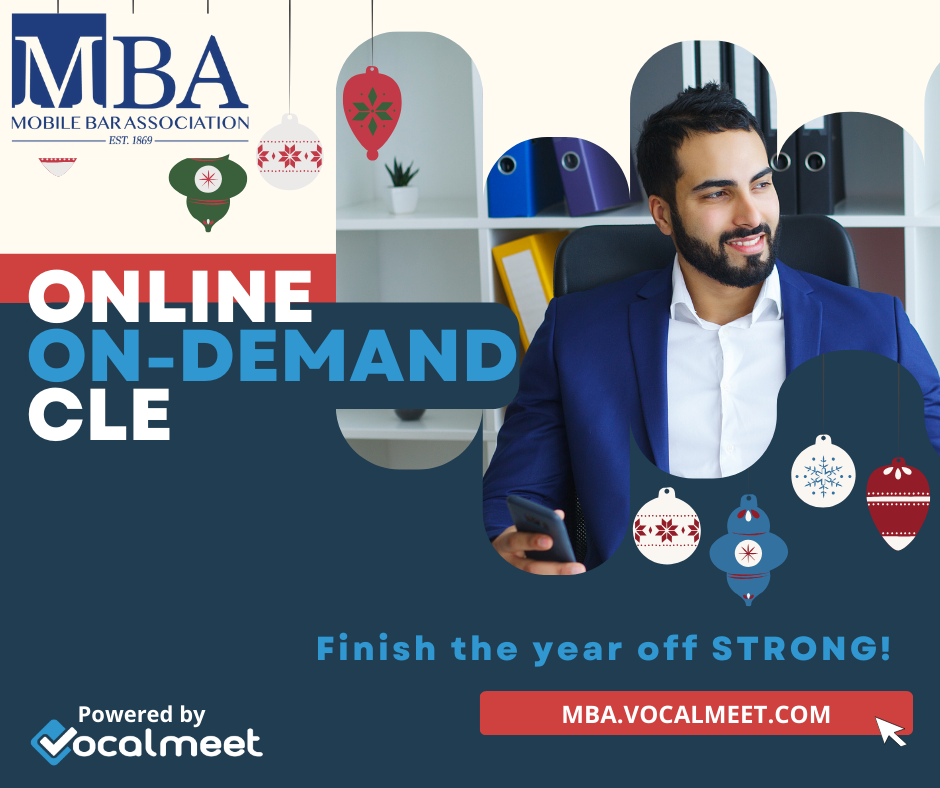 Mark your calendar: Our December Membership Luncheon will be held Friday, December 13, at 11:00 a.m. The festivities will begin with a Membership Appreciation Holiday Social, followed by our regular meeting, in which the Mobile Bar Foundation will present grants to deserving area non-profits. Additionally, the South Alabama Volunteer Lawyer Program will present the annual Ben Kilborn and Margaret F. Demeranville Awards. We will also recognize our past presidents, and I will have the honor of passing the gavel to our next President. Please join us.