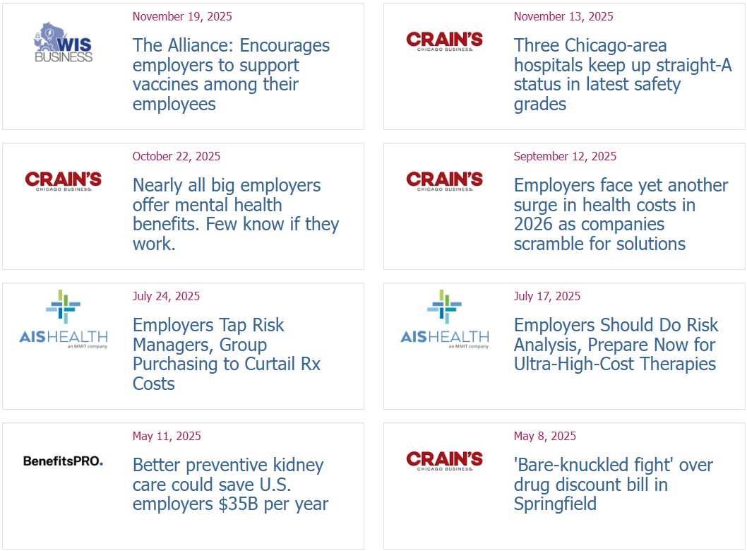 | | Employer Action Briefs & Snapshots | | | In 2025, MBGH launched five new or updated action briefs, three new snapshots and one vaccine statement. Click images to view these resources and be sure to check out all of MBGH's resources. | | In 2025, 16 articles about MBGH events, initiatives and staff were published in publications including the Chicago Tribune, Crain's Chicago Business, Benefits PRO, Employee Benefits News, MedCity News, and more. View recent articles, press releases and news on the MBGH News webpage. | | |