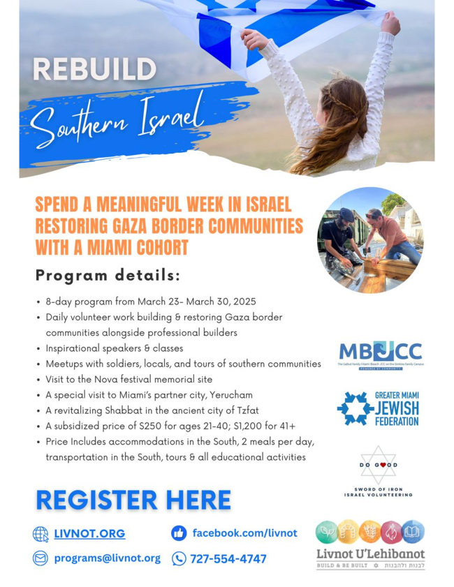 This past week Michelle Ben-Aviv has been announced as the new Board Chair of the Miami Beach JCC. Michelle's commitment to the JCC stems from a deep family connection and a desire to enrich the Jewish community. As she steps into this influential role, her mission is to foster growth and engagement within the JCC, ensuring it remains a vital resource for all stages of life. Join us in supporting her vision for a thriving Jewish community in Miami Beach. | |