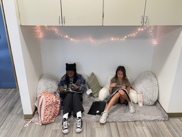The idea was initiated by parents Monique Roth and Wimberly Meyer who have been part of the Social Emotional and Learning (SEL) efforts on campus. They envisioned a space where students could go as an alternative to the playground during lunch. The renovation of the space was fully funded by the Grand View PTA, with additional contributions from parents who generously supported a wish list to furnish and equip the lounge. The Young at Art program also donated art supplies, providing students with opportunities for creativity!