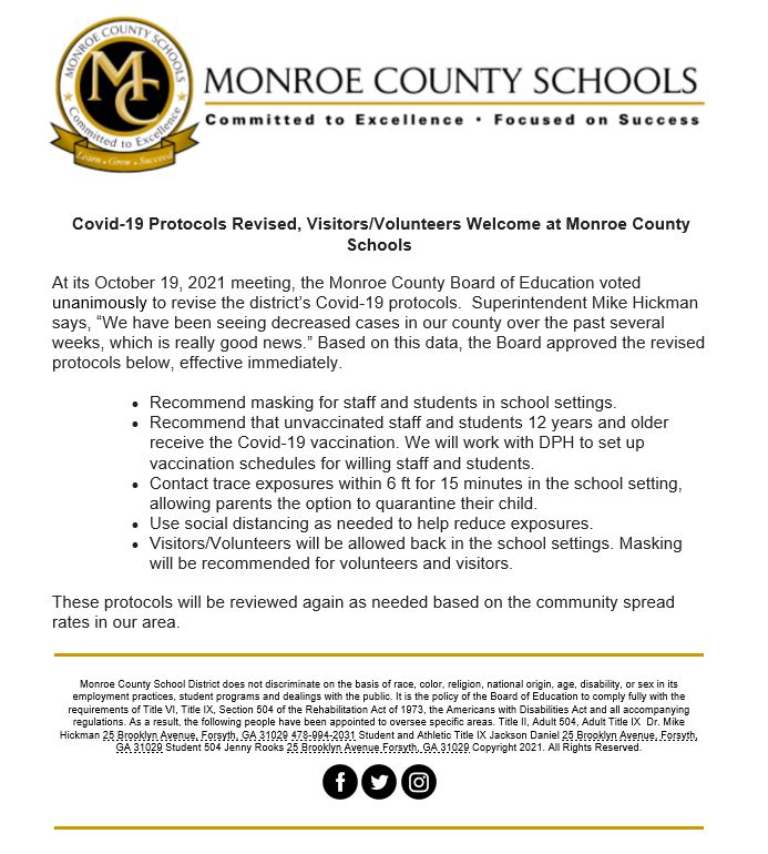 Monroe County School District does not discriminate on the basis of race, color, religion, national origin, age, disability, or sex in its employment practices, student programs and dealings with the public. It is the policy of the Board of Education to comply fully with the requirements of Title VI, Title IX, Section 504 of the Rehabilitation Act of 1973, the Americans with Disabilities Act and all accompanying regulations. As a result, the following people have been appointed to oversee specific areas. Title II, Adult 504, Adult Title IX Dr. Mike Hickman 25 Brooklyn Avenue, Forsyth, GA 31029 478-994-2031 Student and Athletic Title IX Jackson Daniel 25 Brooklyn Avenue, Forsyth, GA 31029 Student 504 Jenny Rooks 25 Brooklyn Avenue Forsyth, GA 31029 Copyright 2021. All Rights Reserved.