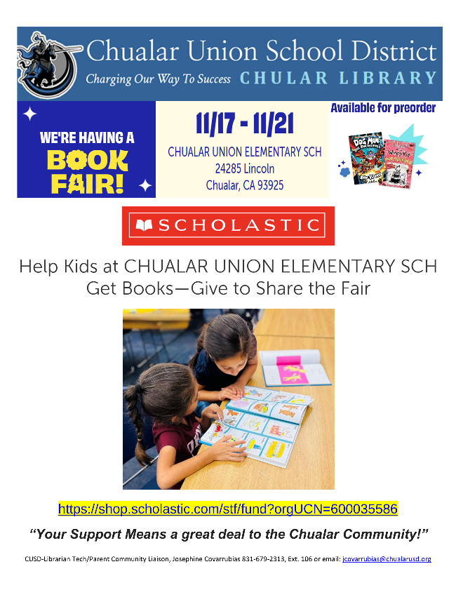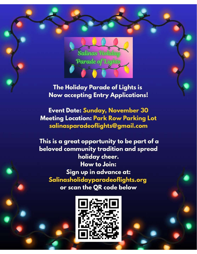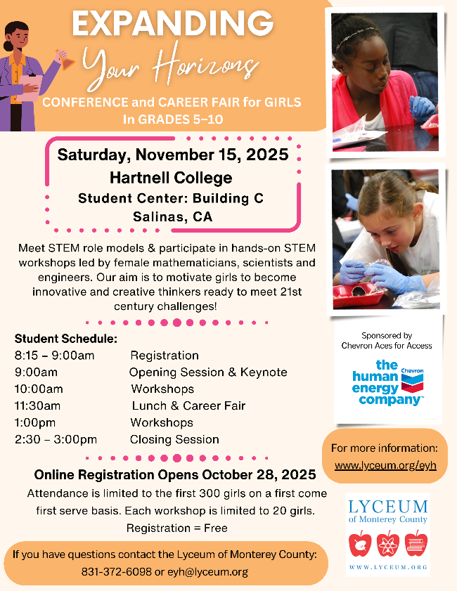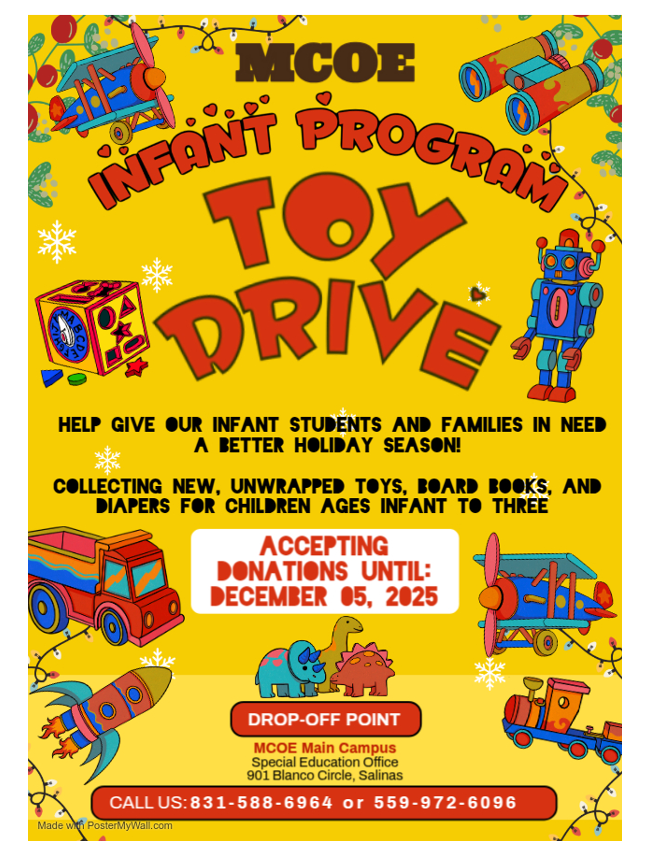 | | The Carmel Jewish Film Festival is offering FREE admission to high school and college students who present a valid student ID. For questions, contact Donna Shore at donna@carmelbethisrael.org. Learn more at www.carmelbethisrael.org/cjff | MCOE's Infant Program is accepting donations until December 5. Drop off new or unwrapped toys, books, and diapers for children ages infant to 3 at 901 Blanco Circle in Salinas. | | The Salinas Holiday Parade of Lights is seeking high school volunteers. High school students will need to bring their volunteer form on the day of the event to receive their volunteer hours. This is a FREE community event open to all ages. The Parade begins Sunday, Nov 30 at 1 Main Street at 6:00 PM. | The Lyceum is hosting its 14th Annual Expanding Your Horizons STEM Conference and Career Fair for Girls in 5th to 10th grades at Saturday, November 15, 2025 at Hartnell College. | | Share the Fair is the giving program built into the Scholastic Book Fair, empowered by contributions from people like you! These funds support students at our school who need help getting new books. Your contribution helps even more kids take home a book from the Fair. | The County of Monterey has shared updated Food Resource Flyer for those in need. Additional food security resources can be found on the County of Monterey website. | | WE WANT TO HEAR FROM YOU! | | |
