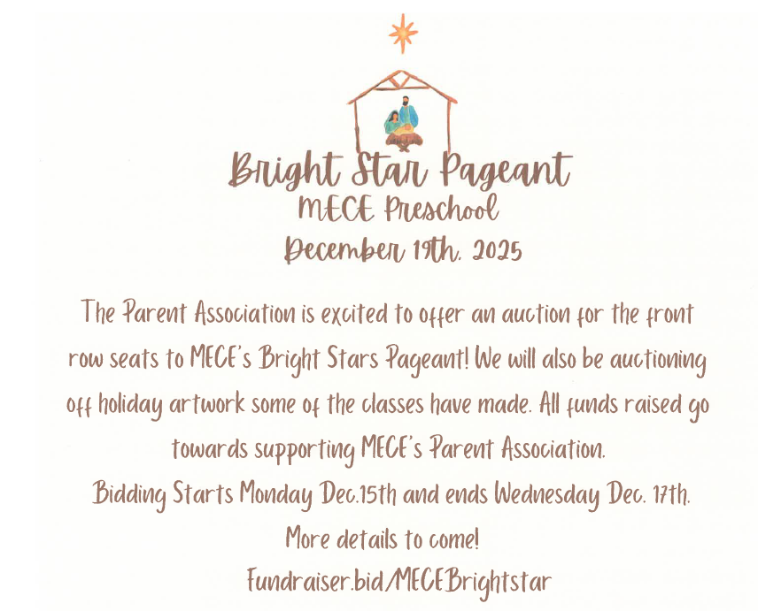 MECE is taking part in the Scholastic/ Pajama Partners annual pajama collection. Please consider donating children's new pajamas. Scholastic will pair these with a new book, and the pajama partners will make sure that children in need will have a sweet bedtime story! Please drop this off by December 5.