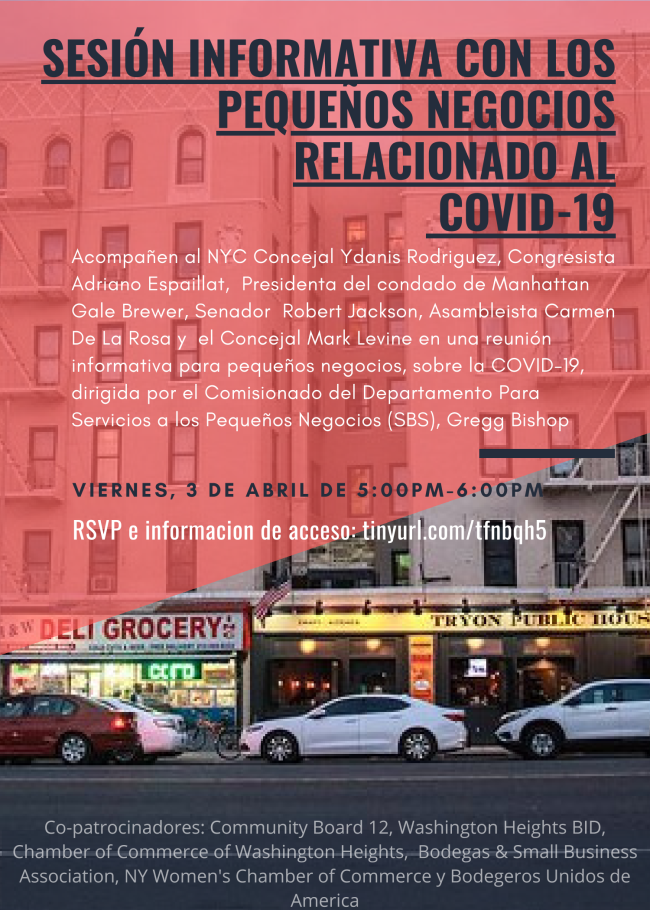 Congresista Adriano Espaillat, la Presidenta del Condado de Manhattan Gale Brewer, el Senador Robert Jackson, la Asambleísta Carmen De La Rosa y el Concejal Mark Levine, conducirán una reunión informativa para pequeños negocios, presentada por el Comisionado del Departamento Para Servicios a los Pequeños Negocios (SBS), Gregg Bishop, para hablar sobre sobre los recursos disponibles para hacer frente al impacto de la pandemia del nuevo coronavirus.