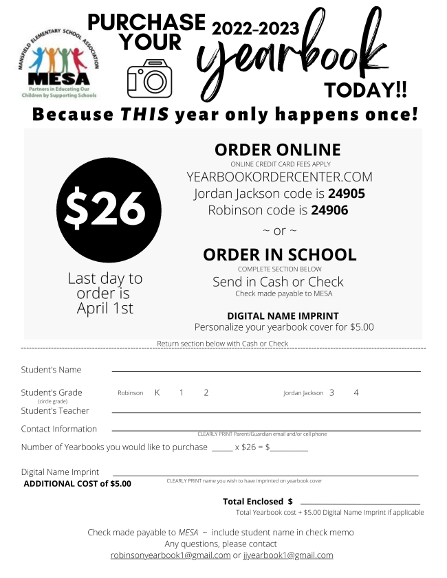 All 5th-grade students will receive a FREE yearbook courtesy of MESA, so there is no need to order. You still have the option to personalize the yearbook cover with your student's name for $5. Simply return the bottom half of the flyer with cash or a check made payable to MESA to your student's classroom.