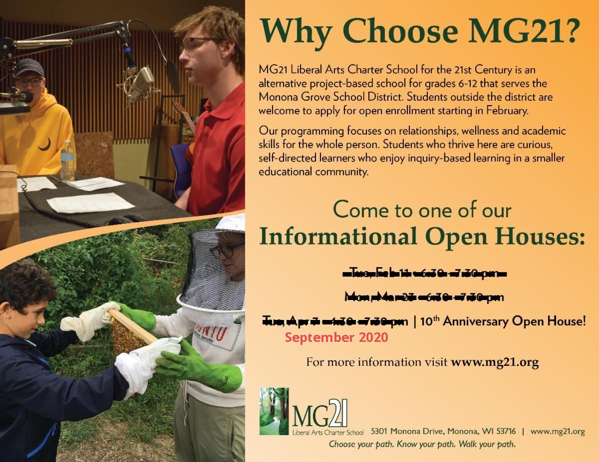 MG21 is a public charter school for students in grades 6 through 12. It is part of the Monona Grove School District. Applications are now being accepted for the 2020/21 school year. Learn more and apply online at: