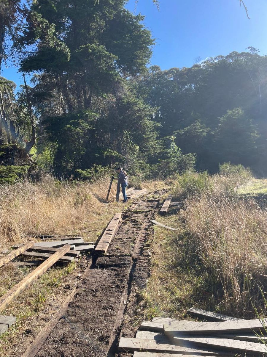 Belinda Point Trail upgrades are underway. Thanks to a generous donation from the Fort Bragg Rotary Club, we are replacing the old, deteriorating boardwalk section of the trail with a new gravel path that will improve accessibility and drainage. The new trail segment will also make some of the existing obstacles easier to navigate and more accessible for a wider range of people to enjoy this popular coastal access trail. MLT Stewardship Project Coordinator Chase Aherns is the Belinda Point project lead.