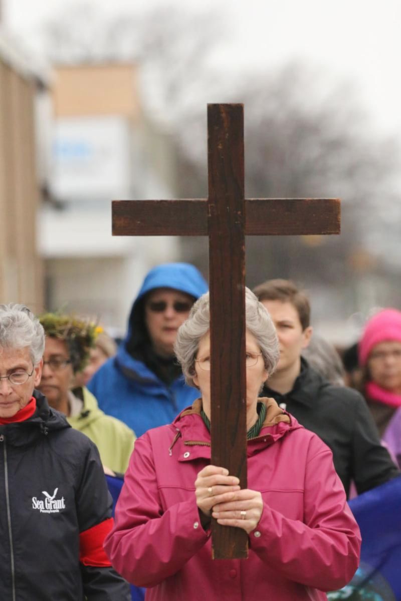 The theme of this year's stations is "The Way of the Cross; The Way of the Migrant." Sister Anne Wambach, OSB, Prioress of the Benedictine Sisters, explained, "For forty years, we have gathered on Good Friday in prayerful remembrance of the passion and death of Jesus. We have walked through our city, calling to mind Jesus' journey to the cross 2000 years ago, as we prayed at places where Christ is still suffering, in the agony and oppression of our brothers and sisters today."